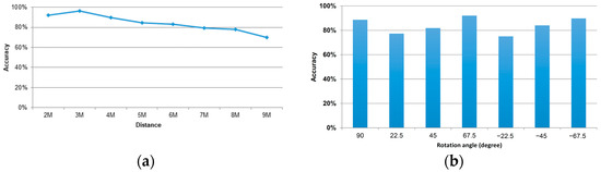According to the statistics shown in Figure 6, training samples of 20 people were used. Therefore, 20% of the data were used as test samples for the artificial neural network. All persons’ distances were tested with the neural network weight under a convergent state. Specifically, the x-axis is the distance from 2 m to 9 m, and the y-axis is the average test accuracy for the 11 persons. The accuracy calculation method was as follows: One must consider that the success rate of the neural network outputs in seven directions could be wrong at each distance because the person faces the camera at an angle of 90 degrees. Therefore, it was similar to the categories of +22.5 and −22.5 degrees, and we could adopt these categories. The reason may be that the recognition might fail, and 22.5 degrees was liable to be read as 90 degrees under the influence of body shape and clothes when the angle was slight.