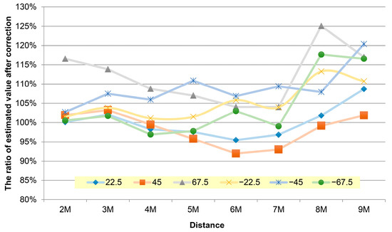 The predicted result was included in the corresponding value. The corrected error value was calculated with the undistorted shoulder width, and at some of the data points like 45 degrees, a significant error was caused due to wrong category estimation. Large errors were generated because the supplemented and corrected shoulder widths were partially overlapped or the left and right shoulders were exchanged and were out of position, thus failing to express the geometric features. The correction points were generated because the shoulder widths could not be easily detected when each person rotated except at an angle of ±67.5 degrees. The data points outside ±67.5 degrees mostly moved towards an accuracy of 100%. We could effectively evaluate the angles the person faces by rendering the angles in categories based on Equation (10). The average accuracy of each of the distances after the estimated values of the person’s directions was mechanically applied. Besides the accuracies in all directions after 8 m and at an angle of ±67.5 degrees, which had a significant average error, it was within a 10% error range.