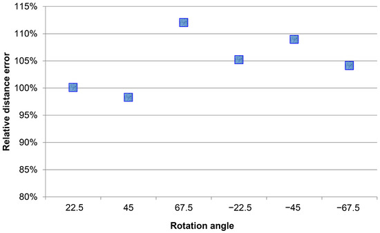 A significant error was generated due to the relationship between the unstable left and right shoulder coordinates, except for the significantly changed 67.5 and −67.5 degrees. As the distance increased, a large angle tended to cause the difference between the corrected shoulder width and the front shoulder width, and most of the test samples were within the interval of ±20%. The y-values in Figure 7, Figure 8 and Figure 9 represent the result of using the angle estimation, returning the shoulder width to the frontal image, and calculating the distance.