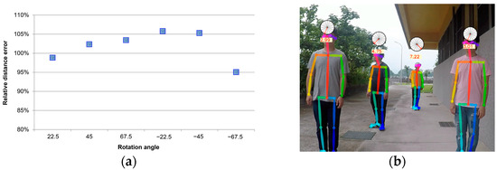 (a) Relative error of the estimated distance using angle correction. (b) Estimation of actual distance using rotation angle.