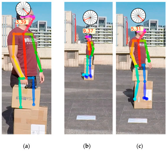 The occluding image test is shown in Figure 10. In most cases, masking could cause some feature points to disappear; for example, the ankle joint could not be distinguished [33,34]. However, the predicted angle value could be correctly output in most cases. Consequently, the influences on direction prediction were minor because we did not refer to the joint points below the knees for extracting our feature points when the persons were partially occluded.