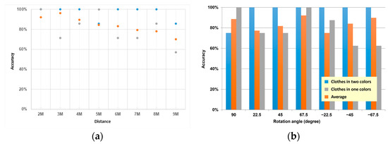 Nevertheless, the actual performance is still close to the average accuracy, especially for the data with more serious interference, which are more likely to have abnormal accuracy. For example, for the different rotation angles (Figure 11b), the performance was good for all angles in the two-color clothing, except for two errors at 5 m and 9 m at 90 degrees. In contrast, the error rate was significantly higher in monochromatic clothing. The reason may be that the prediction point of the hip relationship for monochromatic characters differed from that for bicolor characters.