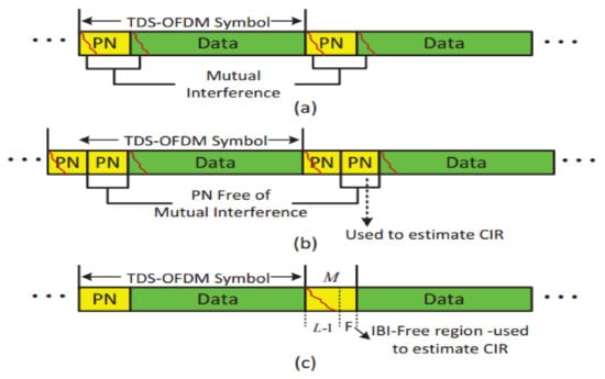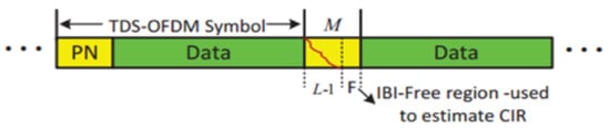 The interference of the TDS-OFDM system has different features, as the OFDM data block is unknown, so it is difficult to get perfect symbols’ detection over the UWA channel as shown in Figure 4. In the TDS-OFDM, mitigation of the IBI represents a big challenge even with perfect channel knowledge. Removing the IBI of the TDS-OFDM data blocks into the training sequence is an uneasy task, as the receiver does not know the transmitted data of the OFDM blocks. On the contrary, the receiver knows the transmitted PN sequence; hence, by knowing the communication channel, removing the IBI of the PN sequence from the OFDM data block is an easy task.