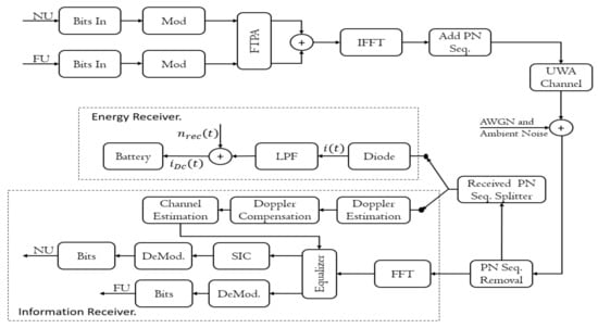 . The high power is assigned to the FU and with a bad channel condition. There are different power allocation schemes of NOMA that have been proposed in the literature [23]. In this paper, the fractional transmit power allocation (FTPA) with a condition, i.e., is used for simplicity. On the transmitter side, bits streams from each user are converted to symbols by using the conventional mapper. The transmitted symbols are then followed by the FTPA for power allocation. and are the transmitted data from the NU and FU, respectively. In detail, as shown in Figure 3, the near and far user modulated bits are powered with different levels of power by using the FTPA scheme. After that, the NU signal and FU signal are combined. The combined signal is modulated over the OFDM conventional modulation using an inverse Fourier transform. The TDS-OFDM PN sequence was added for the modulated OFDM signal in the time domain. The TDS-OFDM frame is transmitted over the UWA channel in addition to adding the additive white Gaussian noise plus the ambient noise effect. On the receiver side, the first step is removing the PN sequence, and this removed sequence is divided into two parts; (1) uncorrupted part; (2) corrupted part. The uncorrupted part is used for Doppler estimation, channel estimation, and Doppler compensation. The corrupted part is used for energy harvesting using a rectifier diode and low pass filter to feed the harvested energy to the internet of the underwater node. The OFDM received frame will be demodulated using the OFDM demodulation system. In the OFDM demodulation system, the Doppler estimation, channel estimation, and Doppler compensation estimated using the uncorrupted part of the received PN sequence are used for equalization. After equalization, the FU demodulated its signal considering the NU signal as noise. For the NU, the SIC technique is used to estimate the information. In our underwater acoustic communication system, the transmitted symbols are multiplexed into a superimposed signal through SC as follows: