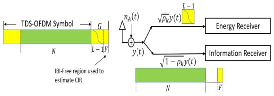 In this paper, the TS energy harvesting system is proposed to be used for the TDS-OFDM-NOMA system as shown in Figure 5. As shown in Figure 5, with the TS-mode, the first data symbols, all the received power will be used for information decoding. As this OFDM subcarrier is carrying the data information, all signal power received is sent to the information receiver to achieve acceptable BER performance. For the residual OFDM frame, PN symbols will be divided into two parts, the first part, the corrupted part