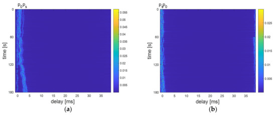 The time evolution of the magnitude baseband impulse response for (a) near UUV at distance 100 m, (b) far UUV at distance 800 m.