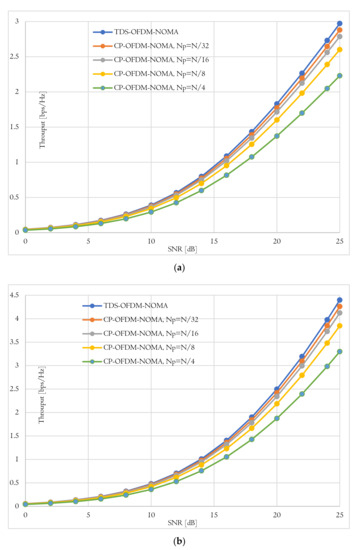 Average throughput achieved by TDS-OFDM-NOMA and CP-OFDM-NOMA under different pilots’ length for (a) Near user and (b) Far user.