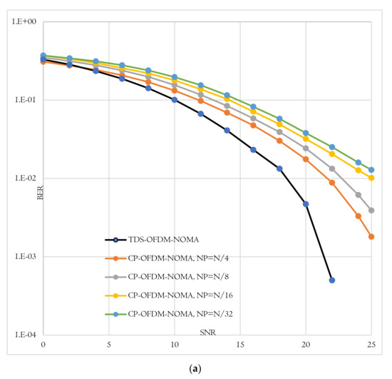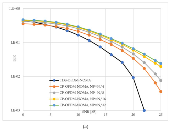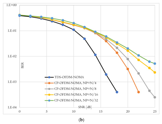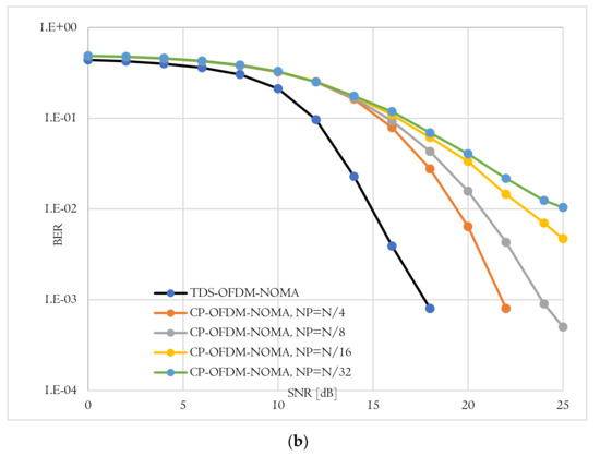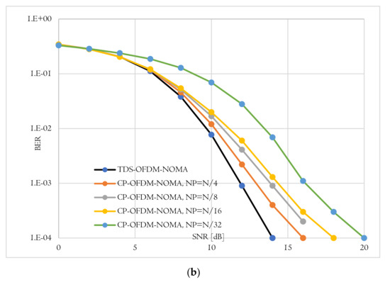 BER-total comparison of proposed TDS-OFDM-NOMA and convention CP-OFDM-NOMA; (a) Uncoded system and (b) Coded system.