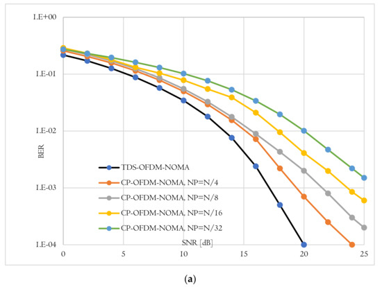 Figure 7 shows the behavior of the total system throughput of the near and far user versus the SNDR in the case of using the proposed TDS-OFDM-NOMA scheme and conventional CP-OFDN-NOMA scheme with different pilots’ length. As known, as the pilot’s length increases, the total system throughput decreases. Thanks to the TDS-OFDM pilot’s freedom, the TDS-OFDM-NOMA provides the highest system throughput for the near and far users. At a SNDR of 20 dB, the near user of the TDS-OFDM-NOMA scheme achieved 2.33 bits per second per hertz (pbs/Hz), while the conventional CP-OFDM-NOMA achieves 2.26, 2.18, 2.04, and 1.75 pbs/Hz for the pilot’s length of and , respectively. In the case of far user, at a SNDR of 20 dB, the TDS-OFDM-NOMA scheme achieved 2.14 pbs/Hz, and the convention CP-OFDM-NOMA achieved 2.07, 2, 1.87, and 1.6 bps/Hz for a pilot’s length equal to and , respectively.