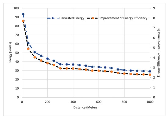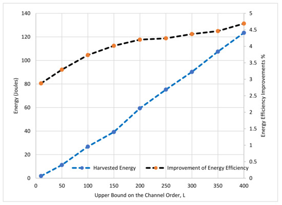 The energy harvested improvement for TDS-OFDM can be reached up to 8% in a short communication distance. Figure 12 shows the performance of the TDS-OFDM over the UWA channel at different maximum channel tap delays, as the maximum channel tap delay increases; the improvement of the energy efficiency and the harvested energy both are increased using the proposed energy harvesting scheme where the duration of the symbols used in harvested energy is increased.