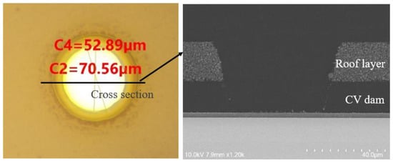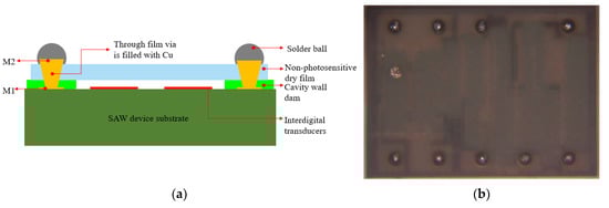 The process flow of the SAW device WLP is depicted in Figure 2, and the details are listed as follows: (1) we prepared a 220 μm SAW filter substrate wafer with IDTs and an M1 layer and used the lithography process to make a CW dam layer. (2) A non-photosensitive dry film was laminated on the CW dam layer using a roller lamination method to make an individual cap for each IDT. As shown in Figure 3, we used laser drilling to drill TFVs with different diameters [,]. Meanwhile, no delamination of the roof layer in the top of the CW dam layer was found from scanning electron microscopy (SEM). The non-photosensitive dry film was a non-hermetic material; the inside of the microcavity had the same pressure as the outside of the device after forming the cavity wall. (3) Physical vapor deposition (PVD) and the RDL process was used to fill Cu into TFVs and form the M2 layer. (4) The solder balls were dropped on the M2 layer by stencil printing and a reflow process. The diameter and height of the solder ball were 110 μm and 70 μm, respectively. The wafer was diced into individual packages after the final solder-balling procedure.