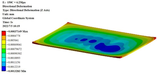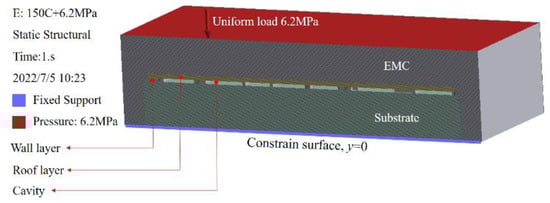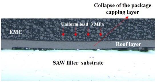 We developed a deflection prediction model to simulate the collapse of the package capping layer in order to forecast the cavity deflection under pressure [,]. A single SAW filter WLP collapse model and its boundary conditions are shown in Figure 11. The restrained surface was stationary (it means that ). After the cavity was created, epoxy molding compound (EMC) was applied to the whole device, and then a consistent load was placed on top of the EMC.