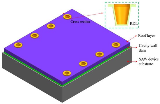 In this paper, the SAW filter with a size of 1.58 mm × 1.18 mm was packaged. There were eight pads on the front side, and each pad had a size of 70 µm× 70 µm. The WLP structure of the SAW device is presented in Figure 1.