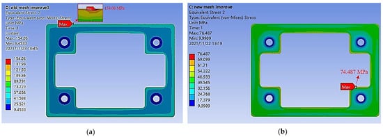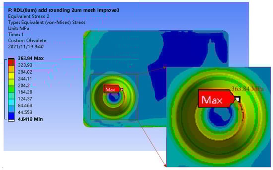 Figure 10 shows the maximal equivalent stress value distribution on the bottom surface of the wall layer. We find that the maximum equivalent stress appears at the bottom edge of the wall layer. Meanwhile, we compared the unimproved and improved SAW filter WLP, and the equivalent (von Mises) stresses were 154.06 MPa and 74.487 MPa, respectively (the maximal stress is marked in Figure 10), which means the maximum stress value decreased by 51.65% on average.