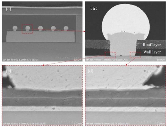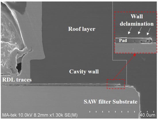 A greater comprehension of the adhesion processes will accelerate the development of microelectronic and SAW filters in order to increase the dependability performance. As a typical wall-layer delamination can be influenced by geometric parameters, it is necessary to investigate those factors in depth. Figure 9 shows the cross-sectional structure of the improved SAW filter WLP. The most significant feature is that polymer materials were added to the SAW device to give extra protection to the exposed bard wall and roof layer on the sidewall. In this way, smaller peeling stress between the wall layer and SAW filter substrate was obtained without wall layer delamination.