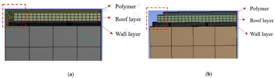 To investigate the stress distribution of Cu RDL traces, an FE model was constructed to calculate the maximum primary stress at each phase of the manufacturing process flows, focusing on the different Cu thicknesses of the vias sidewall at the steady-state cooling process (temperature conditions varied from 260 °C to 22 °C) to achieve high dependability [,]. The package structure model was developed and simplified into four parts in this model, as illustrated in Figure 6, comprising the RDL, roof layer, CW dam layer, and SAW device substrate (from top to bottom), and the material properties are listed in Table 1.