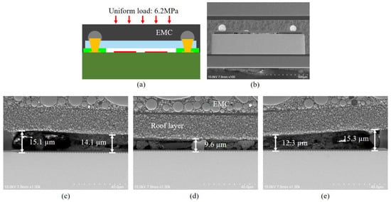 Experimental results of collapse test by applying 6.2 MPa pressure. (a) Schematic of molding pressure test; (b) indicates the SEM image of the SAW device molding pressure test; (c–e) indicate the degree of collapse of the cavity at the left, middle and right positions, respectively.