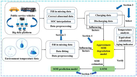 With the arrival of the information age, big data technology has brought opportunities and challenges to the estimation of battery health. Many cities have begun to use big data and monitoring platforms to collect and analyze real-time operating data of new energy vehicles [12]. Estimating SOH through big data is not only conducive to the supervision of the power batteries being used, but also conducive to the disposal of electric vehicle batteries after scrapping. The big data acquisition system will store massive amounts of data. How to filter out effective data is a key issue in estimating SOH. Moreover, the data collected by big data platforms is different from that collected in laboratory experiments. In the process of real vehicle operation, the working conditions of power batteries will also change greatly due to the changes in driver and driving environments. Many dynamic factors will be increased; however, the performance degradation of the battery is more complicated [13].