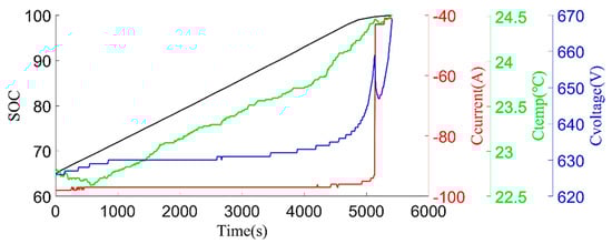 where is the starting moment, is the end time, is totally current, is the sampling time, and is the current capacity. In order to avoid errors caused by SOC correction, the upper limit of the charging interval is selected as SOC = 80%. By observing the SOC data when the car is running every day, it was found that more than 90% of the cut-off SOC was concentrated above 65%, so the lower limit of the charging interval was selected as SOC = 65%.