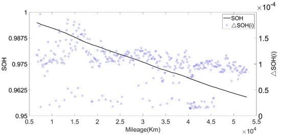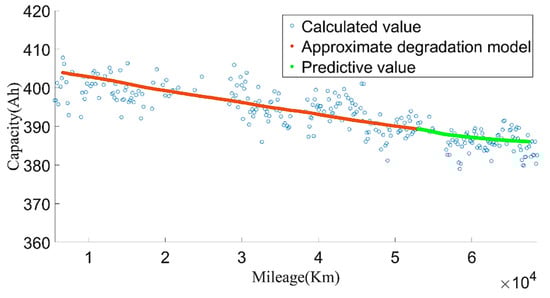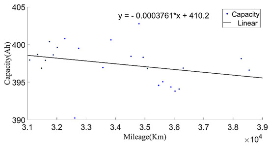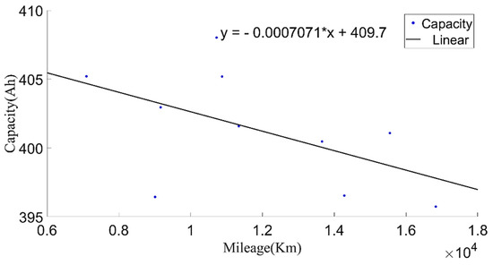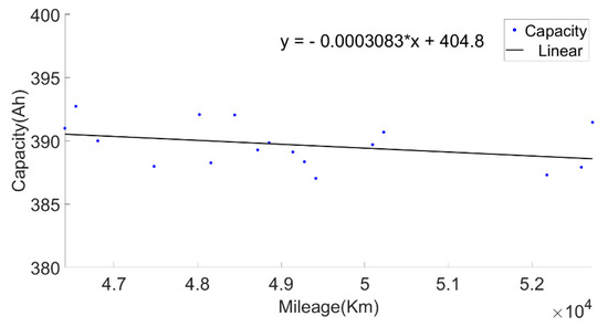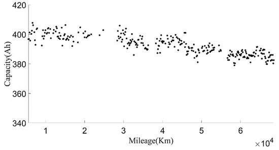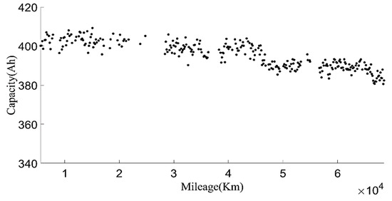 In order to make the current capacity calculation more accurate, a variable sliding window algorithm was adopted, and the lengths of the sliding time windows were selected according to the charging current. When the charging current was 100 A, the sliding time window length was 1600 s and the sliding step length was 10 s; when the charging current was 200 A, the sliding time window length was 800 s and the sliding step length was 5 s. For the capacity value calculated in each process, the box diagram method was used to eliminate abnormal values, and then the remaining capacity values were averaged as the current capacity calculated in each charging process. Generally, the lifetime of the battery was indicated by the number of cycles. However, in the realistic driving of vehicles, due to the driver’s requirements, the usable range of the battery SOC of electric vehicles changed, and the cut-off SOC of the data varied widely, between 25% and 70%. Using the number of equivalent full cycles to represent battery aging is inconvenient and has little practical significance. The mileage of an electric vehicle is a suitable representation of the total discharging capacity of the battery, so the accumulated mileage is used to evaluate the aging degree of the battery [30]. Figure 6 shows the relationship between the present battery capacity and mileage.