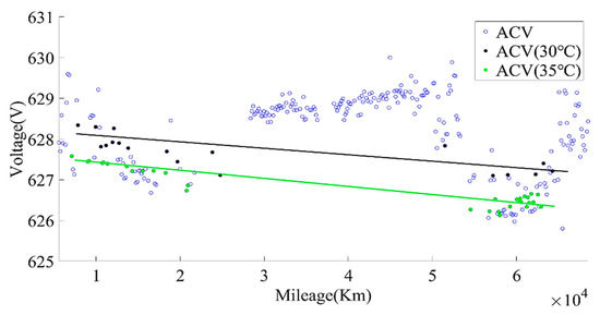 The SOC range for calculating the current capacity was selected, as above, and then the average charging voltage within this range was calculated, as shown in Figure 7. It can be found from Figure 7 that the average charging voltage varied greatly due to temperature. By screening the average charging voltage at 30 °C and 35 °C, the data showed a significant downward trend, which can be used as an indicator for evaluating battery aging. It should be noted that the charging current also had a great impact on the change in the average charging voltage of the battery. When calculating the average charging voltage (ACV), the charging current of the same rate should be selected.