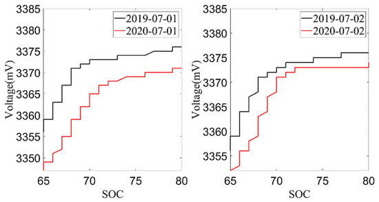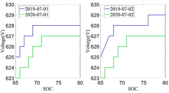 Next, the average charging voltage in July 2019 and July 2020 was analyzed. The data from July 1st and 2nd were selected according to the environmental temperature, charging current and charging temperature conditions, as shown in Figure 8 and Figure 9. From these two figures, it can be found that the trend of the cell voltage and the total battery voltage was consistent. When the battery SOC reached the same value, the charging voltage in July 2020 was lower than the charging voltage in July 2019. The decrease in battery charging voltage also reflects the increase in battery internal resistance, which is also an important indicator for evaluating the battery aging. However, the average charging voltage was much more affected by temperature than the current capacity, so the current capacity of the battery is used as the index to evaluate the battery SOH in this paper.