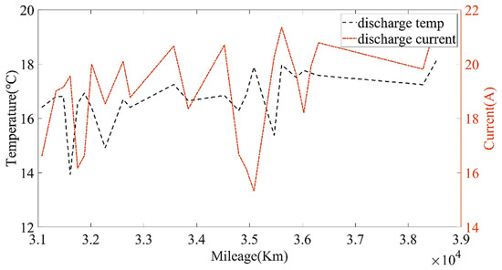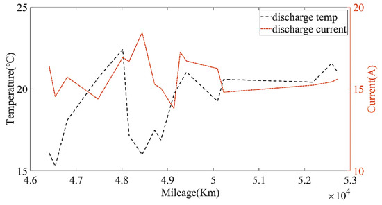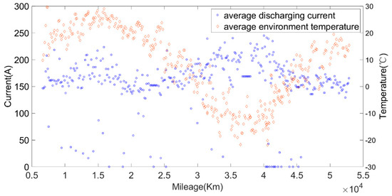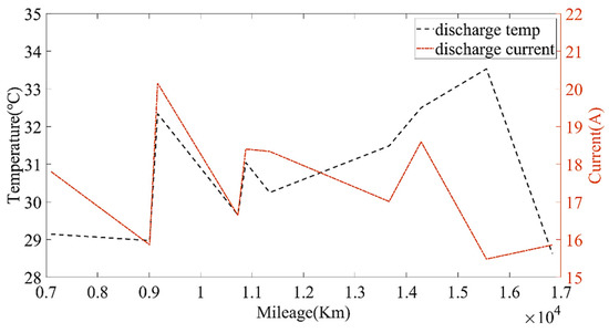 The relationship between the discharging current, average environmental temperature and mileage.