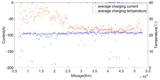 The relationship between the charging current, average charging temperature and mileage.