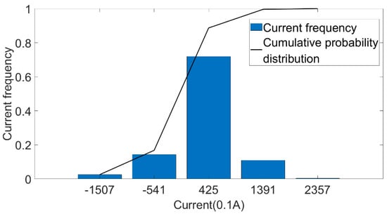 We conducted a statistical analysis on the measured discharging current data of the No. 361 pure electric bus in Changchun during one year of operation. The data included the discharging current data of the line in different operation periods (morning peak, evening peak and normal period). The discharging current was divided into five sections according to the occurrence frequency, and the results are shown in Figure 22. The frequencies were 2.5%, 14.3%, 71.9%, 10.9%, 0.4%.