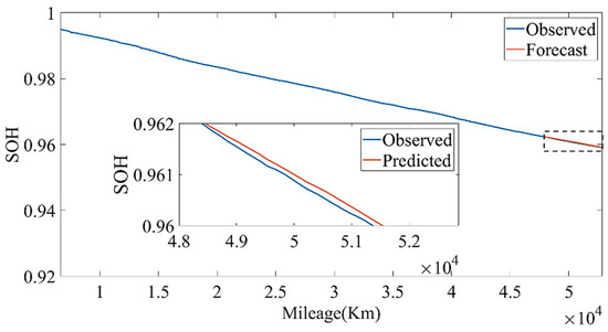 Figure 29 shows that, as the forecast time increases, the model forecast trend tends to be flat, which will lead to greater and greater forecast errors. Therefore, we set out to update the LSTM model with observations. The observed values were obtained by the approximate SOH degradation model, and the network updated with the observed values was used for prediction. By comparing the prediction un-updated results, it could be found that the updated network prediction trend was more in line with the SOH degradation law, as shown in Figure 31.