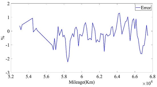 In order to avoid the impact of environmental temperature and charging current on capacity calculation, data with similar environmental temperatures were selected from the data with an average charging temperature of 25 °C and a charging current of 100 A. By comparing the temperature data in the charging time period, the data from 20 May 2019 were selected as the starting value of model calculation, and the data from 24 May 2020 were selected as the ending value of model calculation. Using the method mentioned above, the battery capacity at the beginning () was 403.9106 Ah, the starting mileage was 6482 Km, the battery capacity at the ending time () was 389.2958 Ah, and the ending mileage was 52,862.1 Km. According to the approximate linear degradation law of the lithium iron phosphate battery, the actual factory capacity of the battery () was calculated to be 405.9534 Ah, and the calculated capacity was very close to the rated capacity. The result shows that the proposed algorithm for calculating the current capacity had better accuracy. was calculated by Equation (8), .