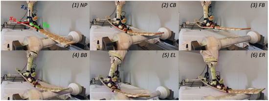 Experimental setup consisting of bending robot with the reference coordinate system (xR, yR, zR) and the PyzoFlex® ski prototype that was equipped with the instrumented 3D markers. Deformation sequence of the ski on the bending robot: NP: neutral position; CB: central bending; FB: front bending; BB: back bending; EL: edging left; ER: edging right.