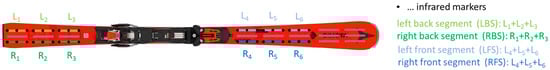 Based on the fact that no valid curvatures can be detected with Qualisys over a sensor with a length of 100 mm [], the ski is divided into four bending segments (left rear segment (LBS), right rear segment (RBS), left front segment (LFS), and right front segment (RFS)) with a length of 340 mm (between two sensors is a gap of 20 mm). According to Figure 3, nine infrared markers are located in one bending segment. In principle, only three points are required to uniquely define of a bending segment in three-dimensional space. However, to improve the signal-to-noise ratio and to minimize fluctuations in the curvature signal, a circle of the form:
