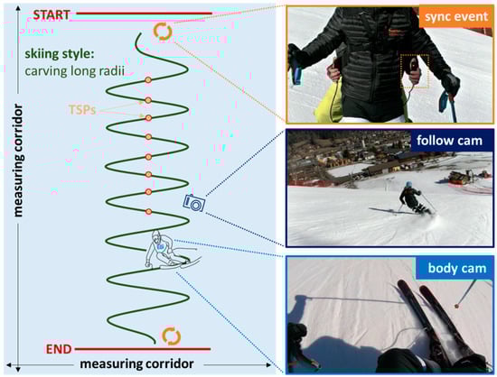 The proof-of-concept field measurement was carried out on 2 March 2021 in the Petersbründel ski area (Austria). The experimental setup is illustrated in Figure 4. The test person (A-level ski instructor) performed 24 carving turns (12 left turns and 12 right turns) with long radii within a defined measurement corridor. A follow cam and a body cam were used to determine the turn switch points (TSPs) of the carving turns. At the beginning and end of the run, the self-built synchronization unit was used to perform the sync event to synchronize the PyzoFlex® data with the video data.