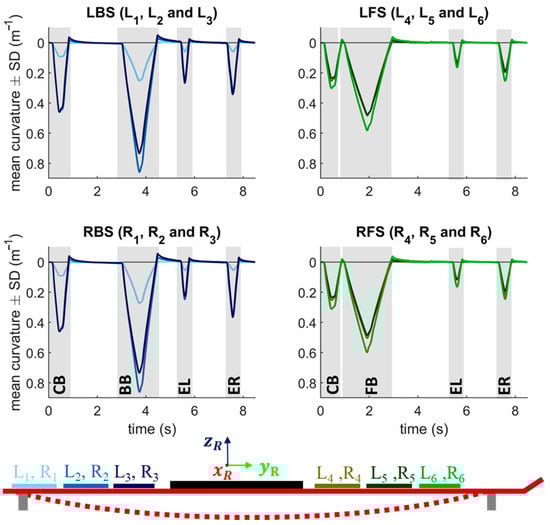 Figure 5 shows the detected as a result of the sequence of five deformation modes (CB, FB, BB, EL, and ER) at vfast. For the illustration of the 12 sensors, the mean value ± SD (in m−1) over 20 repetitions was calculated for each measuring point. A differentiation is made between the left (L1 to L6) and right sensor rows (R1 to R6), showing all the rear sensors in blue (L1, L2, L3; R1, R2, R3) and the front sensors in green (L4, L5, L6; R4, R5, R6). The five deformation modes result in four peaks per sensor, since only the front or rear ski were deformed in the case of FB or BB. The sensors in the rear segments 2 and 3 are activated the most, followed by the sensors in segments 6, 5, and 4. The sensors in the first segment are partially above the support and are the least curved.