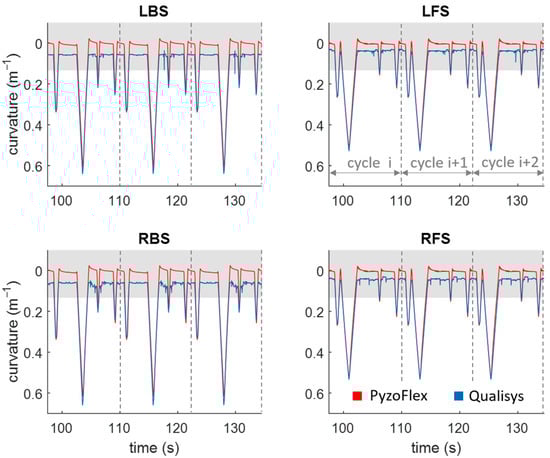 Figure 6 shows the signal of the PyzoFlex® ski in red and the gold standard system (Qualisys) in blue over three bending cycles at vmedium. In the BB situation, the biggest difference between Qualisys and PyzoFlex is obviously seen in the peaks of LBS and RBS. The Qualisys data in the grey marked area cannot be judged, as valid results from Qualisys can only be expected from of 0.13 m−1 upwards [].