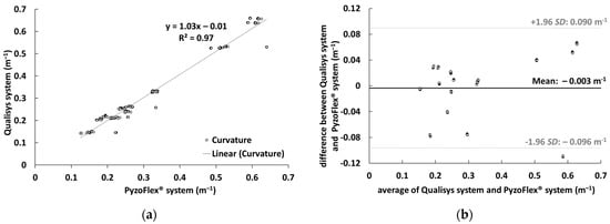 (a): Correlation between the curvature (m−1) that was measured by Qualisys system (criterion instrument) and PyzoFlex® sensor system. (b): Bland–Altman plot showing the difference against the average of Qualisys system and PyzoFlex® sensor system with limits of agreement (LoA) (dotted lines). SD: Standard deviation.