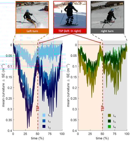 Figure 8 shows the time-normalized (mean ± SE) of 24 carving turns with long radii. The TSP from a right to a left turn is at 0% and 100% and from a left to right turn at 50%. The rear sensors are shown in blue and the front sensors in green. The sensor behind the binding plate (L3) shows the highest peak with a value of about 0.8 m−1.
