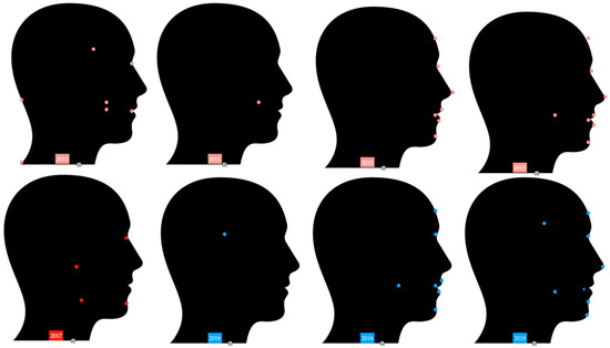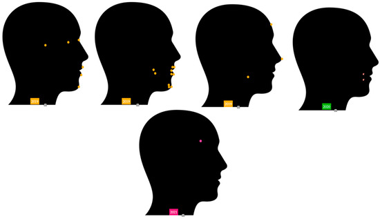 Different research studies suggest very similar locations in the category of stomatognathic system and in areas around them [38,39,40,41,42,43,44,45,46,47,48,49,50,51,52,53,54,55,56,57,58,59,60] Figure 3, Figure 4 and Figure 5.