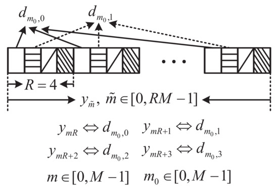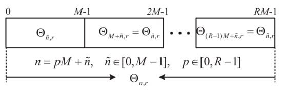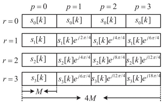 where . Then, the signals are repeated for R times. For the p-th repetition with , is multiplied by the phase coefficient , as shown in Figure 2. Then, for , the signal is obtained as