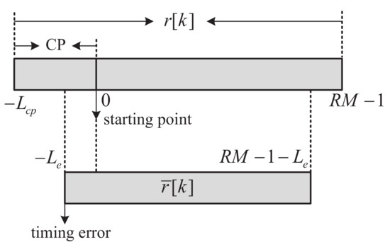 When the time synchronization is perfect, the signal after the CP removing, , is obtained as in Equation (6). Under a time synchronization error, denoted as , the signal can be obtained as