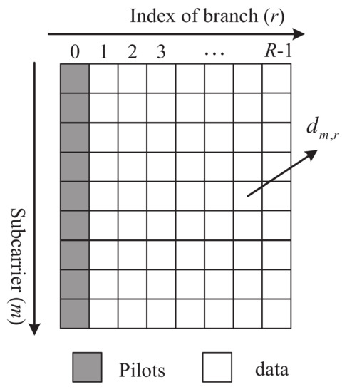 As shown in Figure 7, are set to the pilot symbols, and are data symbols. Note that the variable r in Figure 7 is the index of branch for , not the index of the symbol in the time domain. Then, according to (39), the joint estimation of the frequency channels and the timing synchronization error can be obtained for the indices , i.e.,