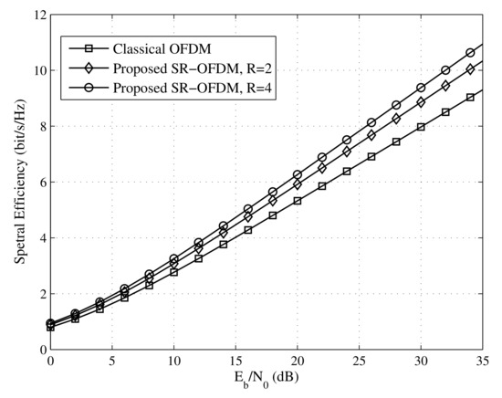 As shown in Figure 8, the spectral efficiency of the proposed SR-OFDM is compared with the classical OFDM, in which is set to T exactly as IEEE 802.11a [8]. The proposed SR-OFDM offers a significant spectral efficiency gain over the classical OFDM, especially for a large R, thanks to the reduction of CP in the proposed SR-OFDM.