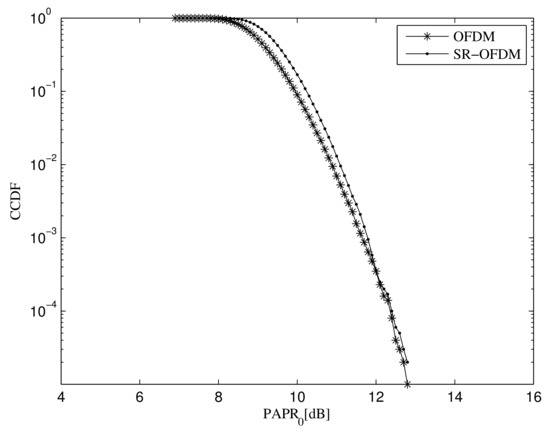 As it is well known, PAPR in multi-carrier modulations is mainly caused by the superposition of all subcarrier signals [28]. However, the signal superposition in the proposed SR-OFDM is not only from the subcarriers but also the branches as shown in Figure 1. To evaluate the PAPR, Figure 9 shows the complementary cumulative distribution function (CCDF) curves of the transmitted signals in SR-OFDM and OFDM, in which the number of subcarriers is . From the simulation results, we see that the PAPR difference of SR-OFDM and OFDM is very limited. The reason is as follows. It has been demonstrated in [28] that the transmitted signal of the classical OFDM follows the Gaussian distribution when the subcarrier number is large enough and data symbols are independent and identically distributed (i.i.d). According to the principle diagram in Figure 1, the transmitted signal of the proposed SR-OFDM is equivalent to the superposition of multiple OFDM signals, which also approaches the Gaussian distribution and leads to a similar PAPR with the classical OFDM.