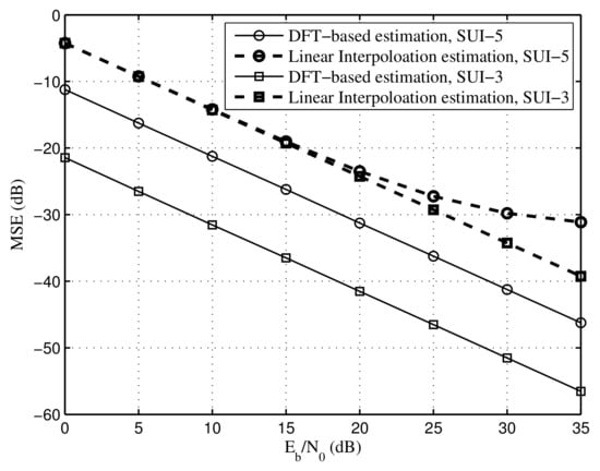 When a time synchronization error exists for the proposed SR-OFDM, it is demonstrated that the time synchronization error and the multi-path channel can be jointly overcome by a single-tap equalizer, as the equation in (37). The joint estimation of time synchronization error and the multi-path channel can be achieved by the proposed algorithms, i.e., the DFT-based estimation and the linear interpolation estimation in Section 3.2. Figure 11 depicts the MSE performances of the proposed algorithms, in which the time synchronization error is set to s. Note that the length of CP is 0.25 T s. The maximum channel delay of SUI-3 is s, and the maximum channel delay of SUI-5 is s. As a result, the time synchronization error s is within the CP, and the CP length subtracting the time synchronization error is still larger than the maximum channel delay for both SUI-3 and SUI-5, i.e., s − 0.9 s > 10 s > 0.9 s. From the simulation results, it is observed that the proposed DFT-based estimation achieves a better MSE performance than the linear interpolation estimation thanks to the time–domain window in the proposed DFT-based estimation. It is worthwhile to point out that the priori knowledge of maximum channel delay is required in the proposed DFT-based estimation. Moreover, for the proposed DFT-based estimation, the MSE of SUI-3 is lower than that of SUI-5, which is because a shorter time–domain window is required, and more noise is removed for the SUI-3 channel. Furthermore, for the proposed linear interpolation estimation, there exists a performance floor of MSE under the channel SUI-5 at the high SNR region compared with the channel SUI-3, which is due to the strong frequency selectivity in the SUI-5 channel.