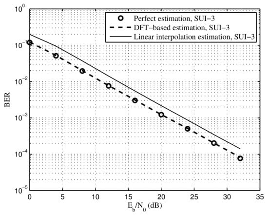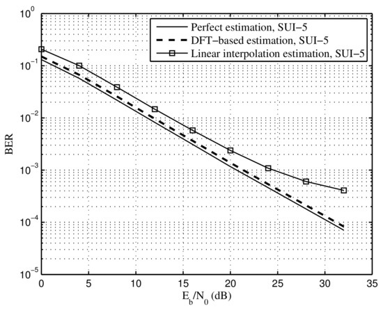 Figure 12 and Figure 13 show BER of the proposed DFT-based and linear interpolation methods under SUI-3 and SUI-5, respectively, in which the time synchronization error is set to s. For both SUI-3 and SUI-5, the BER of the DFT-based method approaches the performance of the perfect estimation, indicating that most of the noise is removed in the proposed DFT-based estimation. Note that the priori knowledge of maximum channel delay is required in the proposed DFT-based method. Moreover, the proposed linear interpolation method suffers from a performance floor of BER at high SNR under the SUI-5 channel, which means that a bit distortion for the estimation of the channel exists as well as the time synchronization error, especially for the channel with strong frequency selectivity.