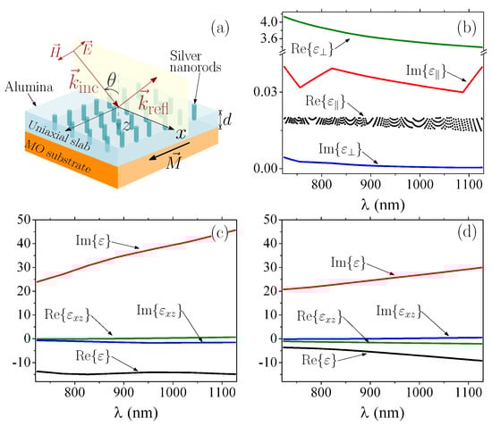 -near-zero behavior can be achieved using transparent conducting oxides [12,29] (e.g., indium tin oxide and Al-doped zinc oxide) or uniaxial metamaterials [24,30] that work near the plasma frequency, i.e., the frequency where the real part of the permittivity changes its sign. Although the option of using conductive oxide materials seems simpler at first glance, their electromagnetic responses are highly dependent on manufacturing temperature and doping, which imposes several conditions on the manufacturing process. On the contrary, the electromagnetic responses of single layers comprising plasmonic nanorods, immersed in a dielectric host, only depend on the geometry of the system, which can be easily tuned with available experimental techniques [30]. Therefore, we consider an uniaxial slab (of thickness d) composed by Ag nanorods in alumina (AlO), as schematically represented in Figure 1a. The permittivity tensor for these uniaxial materials can be written as [24]