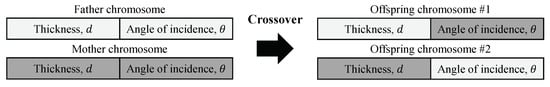To overcome these limitations, we used a GA that optimized the -near-zero magnetophotonic nanostructure. Since the substrate and the incident medium are semi-infinite, the geometry of the structure is defined by the thickness d of the uniaxial slab (see Figure 1). Therefore, the GA began by randomly creating an initial population of “chromosomes” (that is, comprising a set of points () ), as depicted in Figure 2, and then performed selection, crossover (see Figure 3 for further details), mutation, and elitism operations to evolve based on the fitness function until at least one of the chromosomes met the predefined stopping criterion, as illustrated in Figure 4. This last figure specifically shows the flow chart (in the left panel) of the GA used to design a magnetophotonic nanostructure exhibiting optimized TMOKE, i.e., the TMOKE equation was employed as the guide (the fitness function) to search for the optimal parameters’ values. The GA was developed in Matlab, and the numerical results of TMOKE (the fitness function) were automated by linking the GA with an SMM-based algorithm (also in Matlab), as shown in the right panel of Figure 4. At first, the GA determined parameters such as population size (N), the number of chromosomes that survive and pass to the next generation (), the number of chromosomes to be created from the crossover (), the mutation rate (), the standard deviation of the mutation random variable (), and the number of fittest chromosomes from the current generation that are passed (unaltered) to the next one () due to the elitism operation. The parameter is the standard deviation of the zero-centered Gaussian random variables added to the chromosome elements (e.g., d and ) to mutate them. Subindex refers to the mutation operation. The initial chromosome population was created from uniformly distributed random variables, with their values drawn, respectively, from the closed intervals and , whilst the other parameters were defined as , , , , , and chromosomes.