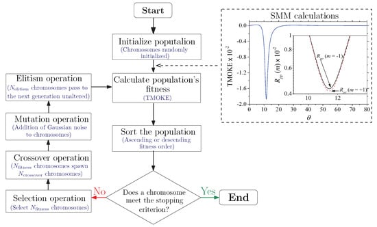 The flow chart of the GA used for the design of -near-zero magnetophotonic nanostructures with optimized TMOKE values. The dashed rectangle at the top right side shows the calculation of TMOKE and reflectances (in the inset), using the SMM algorithm, for a randomly generated population of chromosomes in the first step on the left side. This last procedure is illustrated using an initially selected arbitrary chromosome.
