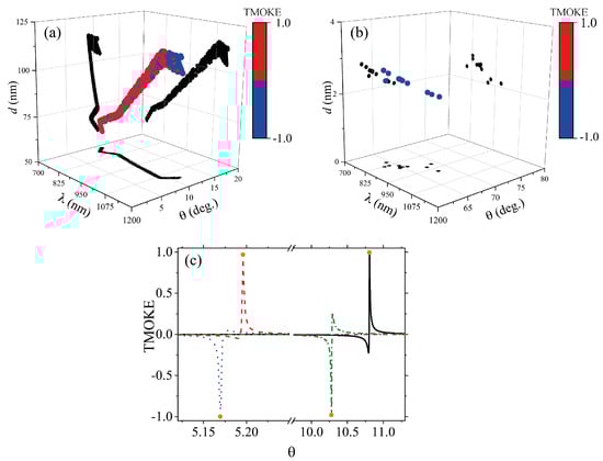 Multidimensional plot of GA optimized -near-zero magnetophotonic nanostructures for giant TMOKE amplitudes. Each point in the 3D plot represents a set of values (), where the color scale is used to represent the fourth dimension on the graph (corresponding to the TMOKE value). For visualization purposes, the results are shown for (a) and (b) . For eye-guide, we plotted projections along the (), () and () planes with solid black dots. A comparison of the GA results () with the exact numerical results from the SMM is shown in (c) for the set of values (818.83 nm, 71.998 nm, 10.807 degree), (830.72 nm, 307.49 nm, 5.196 degree), (846.58 nm, 315.5 nm, 5.1696 degree), and (873.33 nm, 81.563 nm, 10.279 degree), whereas the solid, dashed, dotted, and dash-dotted lines, represent the exact SMM calculations for the corresponding structures. All the results in this figure were obtained for the system with the Co-substrate. Analogous results (not shown here) were obtained for the system with the Fe-substrate.